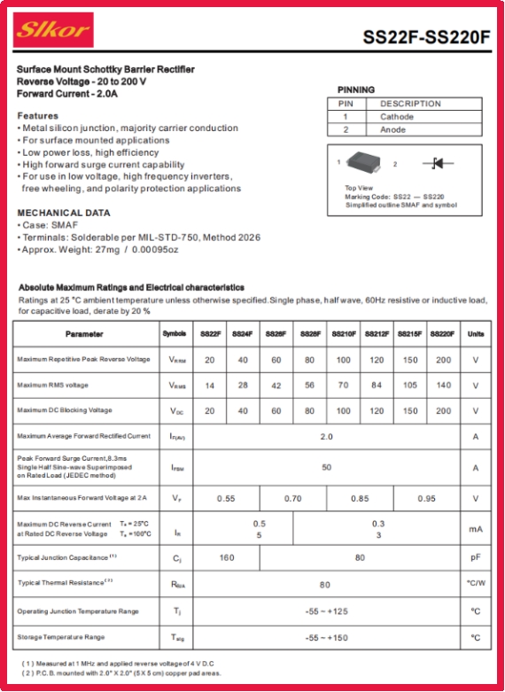 為了確保slkor薩科微肖特基二極管SS24F能夠發(fā)揮出最佳性能,在使用過程中需要注意一些事項。