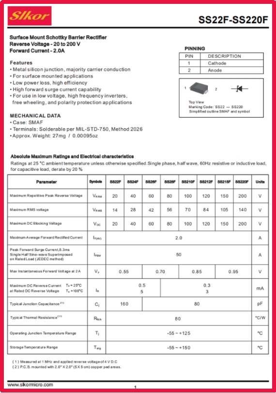 在新能源汽車充電樁的電流轉換中,在工業機器人伺服系統的電源保護里,在戶外LED顯示屏抵御電壓波動的防御機制中,一顆直徑僅3mm的肖特基二極管正以“隱形衛士”的姿態,守護著電子系統的穩定運行。slkor薩科微推出的SS210F,憑借100V反向耐壓與2A整流電流的突破性組合,重新定義了中高壓場景下的電源管理標準,為工程師提供了更高效、更可靠的解決方案。