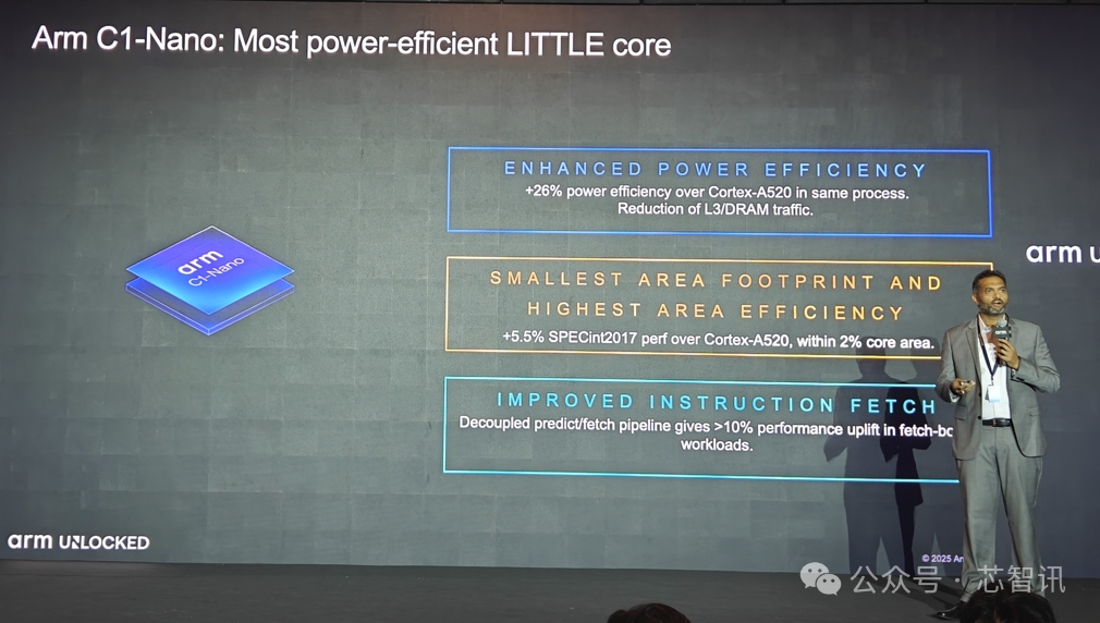 C1-Nano 在最小面積占用的條件下,將 Arm C1 系列 CPU 的優勢集于一體。相比此前的Cortex-A520小核,C1-Nano電源效率大幅提高,在同一工藝下,與 Cortex-A520 相比,電源效率提高 26%了;減少 L3/DRAM 交互,實現了最小面積和最高區域效率。與 Cortex-A520 相比,SPECint2017 性能提高 5.5%,核心面積提高 2%;改進了指令獲取,解耦預測/獲取流水線在獲取工作負載方面提高了10%以上的性能。