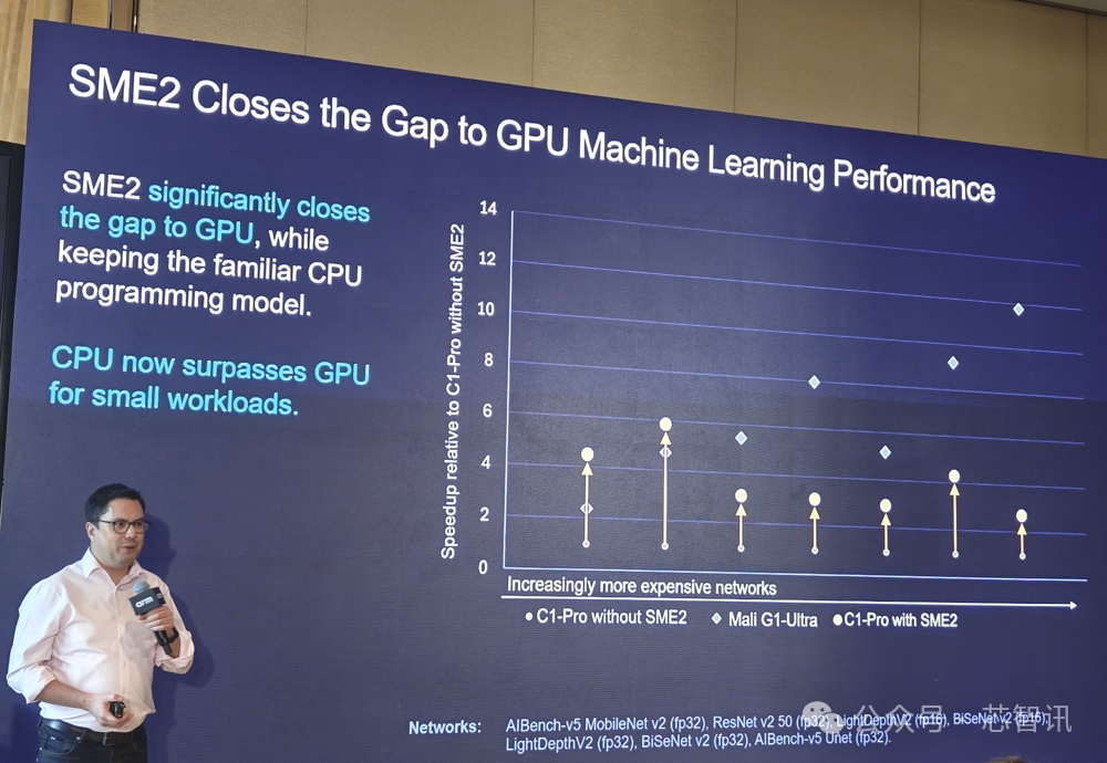 Arm表示,SME2 顯著縮小了C1 CPU與GPU之間的AI性能差距,特別是在小型AI工作負載上,CPU 現已超越 GPU,并且保留了CPU的靈活性。