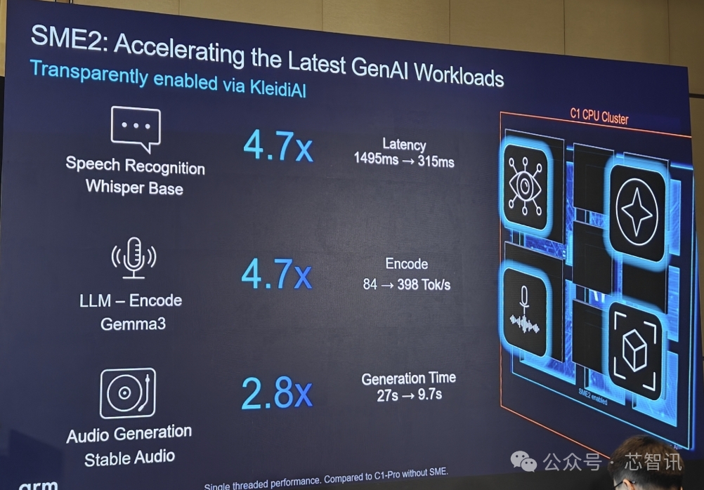 得益于 SME2 內置的矩陣擴展,Arm C1 CPU 能夠加速 AI 功能,包括涉及大量矩陣運算的大語言模型 (LLM)、媒體處理(圖像與視頻)、語音識別、計算機視覺、實時應用(AI 助手、計算攝影與 AI 濾鏡)以及多模態應用等。SME2 是在 SME 基礎上進行了全新的智能升級,能提升性能、降低內存占用,并使端側 AI 運行得更為流暢,尤其是在音頻生成、攝像頭推理、計算機視覺及即時聊天等高實時性要求的應用中。