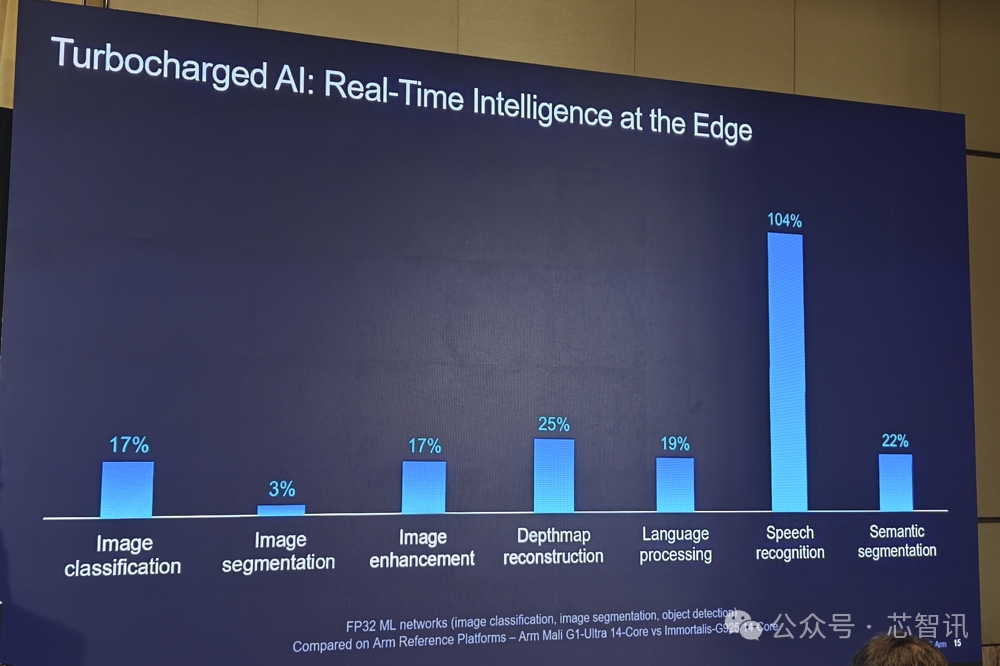 AI 正在重塑移動設備思考、感知與響應的方式,而 GPU 在這一演進歷程中扮演著關鍵角色。Mali G1-Ultra 引入新的矩陣乘法單元 (MMUL) FP16 指令,可加速如語義分割、去噪、深度估計、物體檢測、語音識別和圖像增強等端側關鍵 AI 工作負載。在FP32 ML網絡中,Mali G1-Ultra與上一代 Immortalis-G925(同樣均為14核心)相比,其性能提升高達 104%。