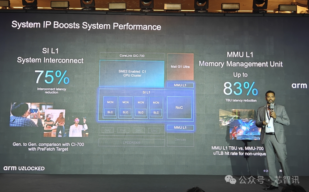 Lumex CSS平臺要支持 AI 優先體驗,自然不能只局限于CPU、GPU等計算 IP 和前面提到的多核調度的DSU IP的提升,還必須在整個互連和內存架構層面持續演進。所以,Arm為了Lumex CSS平臺帶來了全新的SI L1和MMU L1和NoC S3等系統IP,專為滿足高要求 AI 和其他計算密集型工作負載的帶寬與延遲需求而優化。
