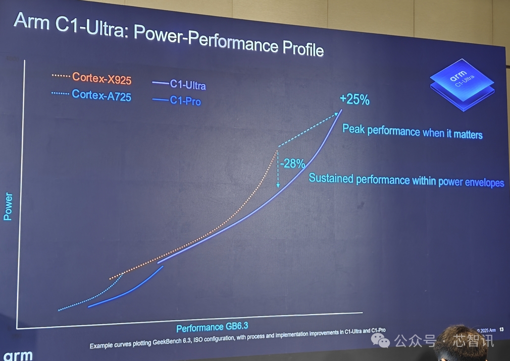 從Geekbench 6.3測試表現來看,在同等性能下,C1-Pro的功耗要比Cortex-A725低26%;在同等功耗下,C1-Pro的性能要比Cortex-A725高出11%。