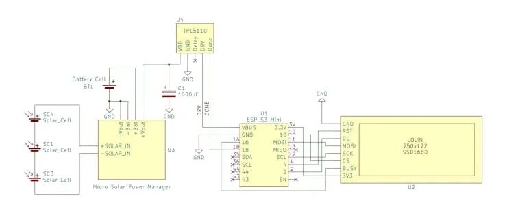 電源鏈路:太陽(yáng)能板 → SPV1050 → 電池 → TPL5110 →(系統(tǒng)電源)→ ESP32-S3 & 墨水屏。