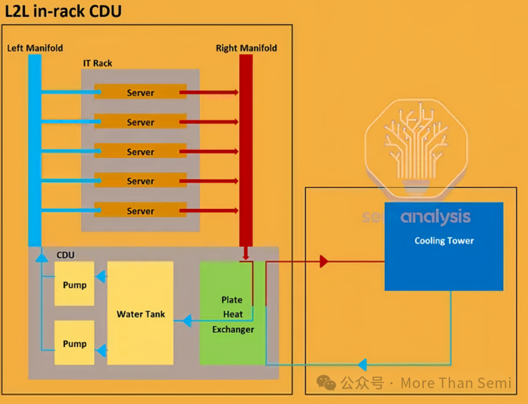 IT Rack:里面安裝有多臺 Server(服務器),服務器在運行時會產生大量熱量,需要液冷系統進行散熱。 Left Manifold(左側集流管):負責將冷卻液體輸送到各個服務器,為服務器提供冷卻介質。 Right Manifold(右側集流管):用于收集經過服務器、吸收了熱量的冷卻液體。