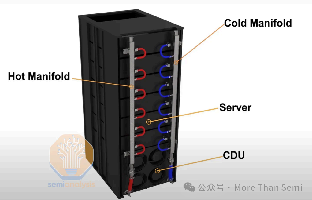 下面的圖是一個GB200 NVL72機架的簡易示圖,可以看到Manifold左右兩側的顏色是不一樣的,藍色表示里面的冷側歧管,也就是上面圖中的Left Manifold,來自CDU的低溫冷卻液在此分路,送往各服務器的冷板;紅色表示熱側歧管,也就是上面圖中的Right Manifold,服務器冷板流出的高溫冷卻液在此匯總,回流至CDU。