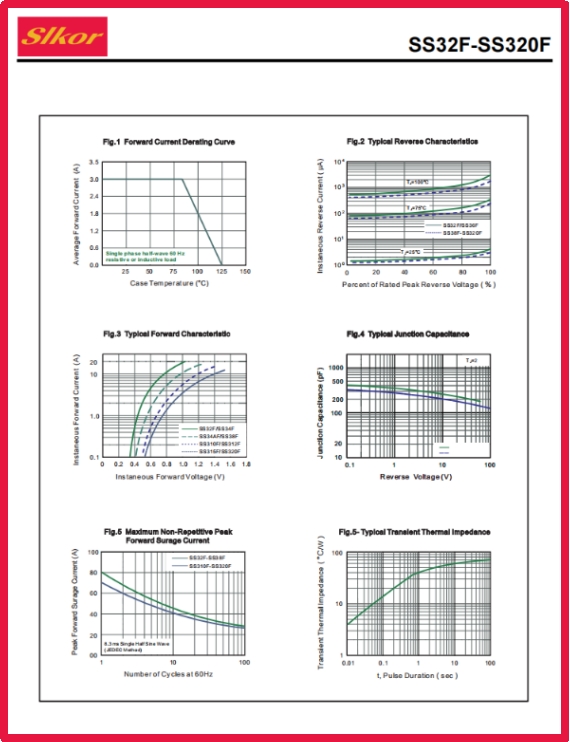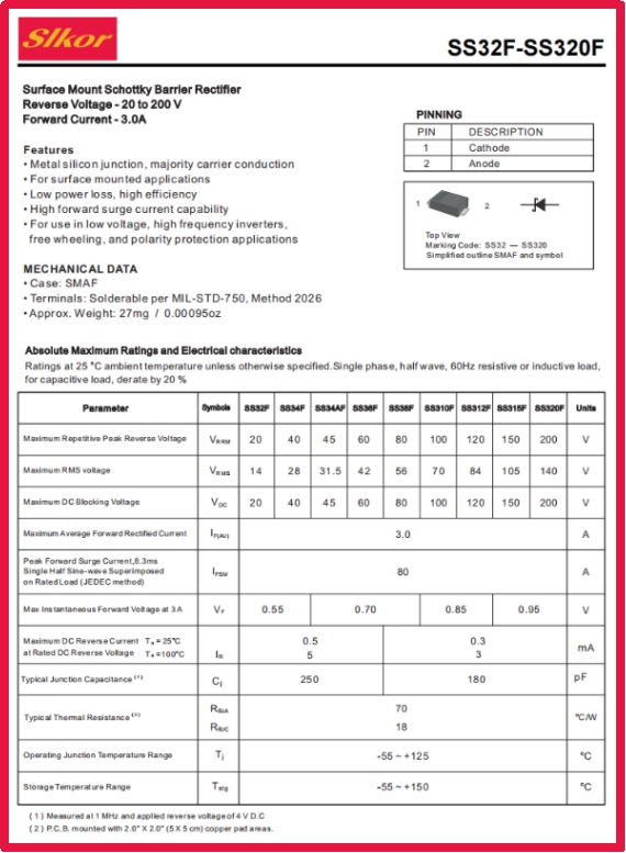 薩科微Slkor肖特基二極管SS34F相關(guān)參數(shù)
