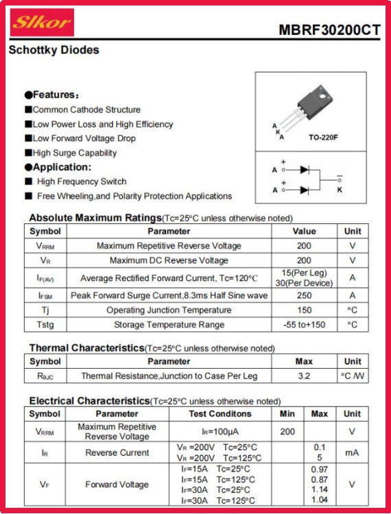在5G基站晝夜不息的嗡鳴聲中,在新能源汽車電機(jī)精準(zhǔn)的轉(zhuǎn)速控制里,在光伏板將陽(yáng)光轉(zhuǎn)化為電流的瞬間,一場(chǎng)關(guān)于電力電子器件的效率革命正在悄然發(fā)生。薩科微Slkor推出的MBRF30200CT肖特基二極管,以“高頻低損”與“熱控藝術(shù)”的雙重突破,重新定義了功率器件的性能邊界。