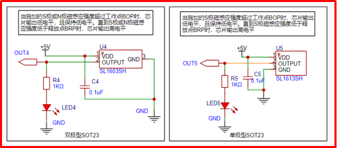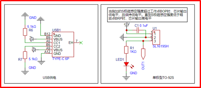 薩科微霍爾SL1609 SL1603X SL1613X都是低功耗霍爾開關,其輸出電流最大5mA,可以直接驅動小信號開關等負載,此處直接接1K電阻和LED燈,當感應到磁場時候LED燈熄滅。