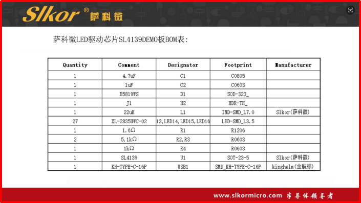 7.薩科微 LED驅(qū)動芯片SL4139 DEMO板BOM表信息如下: