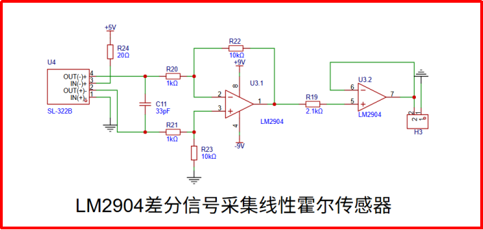 4.1圖一為薩科微運算放大器LM2904。該運放采集小信號進行放大,LM2904因其低輸入失調電壓和失調電流特點非常適合傳感放大器、音頻 放大器、工業控制、DC 增益部件和所有常規運算放大電路。上圖為薩科微LM2904差分采集的線性霍爾SL-322B經過10倍放大輸出給MCU采集信號,來判斷磁場的位置和大小。線性霍爾SL-322B規格書有說明磁場強度對應輸出電壓大小,經過放大后就能得出該位置磁場值。該差分電路廣泛用于電壓采樣和電流采樣。