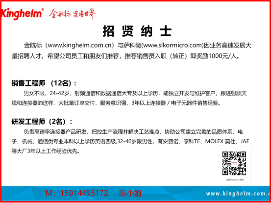 金航標Kinghelm(www.kinghelm.com.cn)電子成立于2007年在深圳市華強北,是研發(fā)、生產(chǎn)、銷售、技術服務一體化發(fā)展的國家高新技術企業(yè),十多年來深耕射頻微波技術,研制信號收發(fā)傳輸產(chǎn)品組件,產(chǎn)品包括北斗GPS天線、各系列連接器接插件端子臺、天線連接器接插件的開模定制以及配套的解決方案,“Kinghelm”(www.kinghelm.net)品牌在國內和國際有影響力和美譽度!金航標創(chuàng)始人暨董事長宋仕強先生介紹道,“金航標,連接世界”,金航標公司技術骨干來自清華大學,吸納電子科技大學和海歸技術人才,做到東莞塘廈的研發(fā)部、廣西鹿寨縣工廠、深圳市龍華區(qū)中轉倉、龍崗總部的銷售部供應鏈部,都和客戶的產(chǎn)品需求信息同步對應,實現(xiàn)了協(xié)同化、數(shù)字化、智能化、流程化管理,成為電子信息行業(yè)非常有競爭力的公司!金航標與同為宋仕強先生投資經(jīng)營的薩科微Slkor半導體(m.ax99.cn)一起為電子整機產(chǎn)品公司提供配套服務,成為全世界超過15000家客戶的合作伙伴,致力于“走國產(chǎn)化與國際化之路,爭取成為半導體領導者”!宋仕強:國務院經(jīng)濟發(fā)展中心民營經(jīng)濟研究員,中國科學技術協(xié)會電子信息專家?guī)斐蓡T、華強北商業(yè)研究專家。宋仕強曾任某國際地產(chǎn)上市公司CEO,現(xiàn)投資經(jīng)營深圳市薩科微半導體有限公司與深圳市金航標電子有限公司,兩家企業(yè)均是國家級高新技術企業(yè),原創(chuàng)性獲得發(fā)明專利和軟件著作權幾十項。宋仕強在電子行業(yè)耕耘多年,為深圳市華強北更好的營商環(huán)境在不斷努力,希望華強北成為改革開放的窗口和深圳經(jīng)濟發(fā)展的名片。