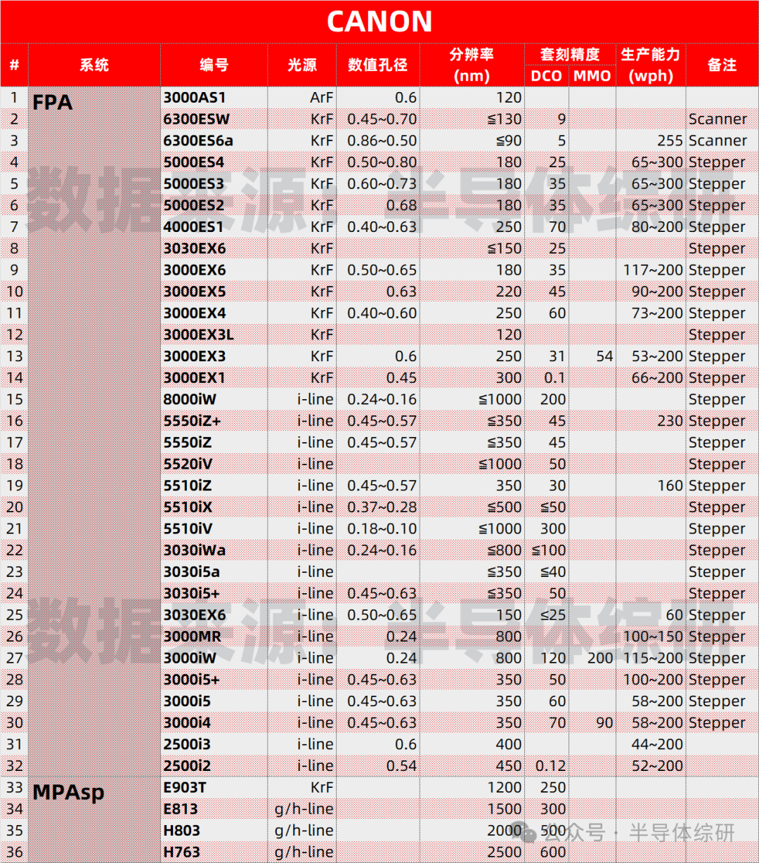 ASML、NIKON、CANON光刻機型號參數匯總